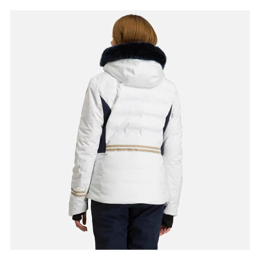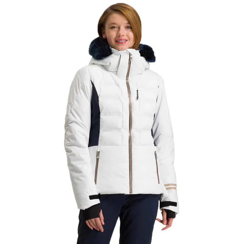 Immerse yourself in winter warmth. The women´s Depart Ski Jacket blends the latest waterproof and breathable technology with elegant, mountain-inspired style to keep you warm on the mountain. Parallel stripe details on the sleeve and back echo fresh ski tracks in the snow, and a signature rooster reflects the Rossignol alpine legacy. High-loft synthetic insulation offers premium warmth comparable to the feel of down, and zip vents let you regulate your temperature as necessary. Fully taped seams and bonded insulation baffles enhance storm protection. Details like stretch cuffs with thumb loops, an attached goggle cloth and a built-in powder skirt extend your comfort range on cold days. The removable hood features detachable faux-fur trim so you can customize your look.