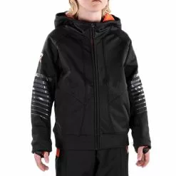Slalom training jacket for junior racers features 10K waterproofing, softshell construction with fleece lining, goggle and phone pockets, two large side pockets, and full zip.